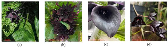 Examples of dark purple flowers. (a) Flower of Tacca chantrieri. (b) Flower of Dahlia pinnata. (c) Spathe of Zantedeschia aethiopica. (d) Flower of Clowesia jumbo.