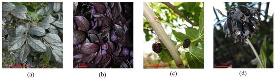 Examples of dark purple leaf and fruit. (a) Leaf of L. chinense var. rubrum. (b) Leaf and fruit of P. cerasifera. (c) Fruit of M. alba var. alba. (d) Fruit of T. chantrieri.