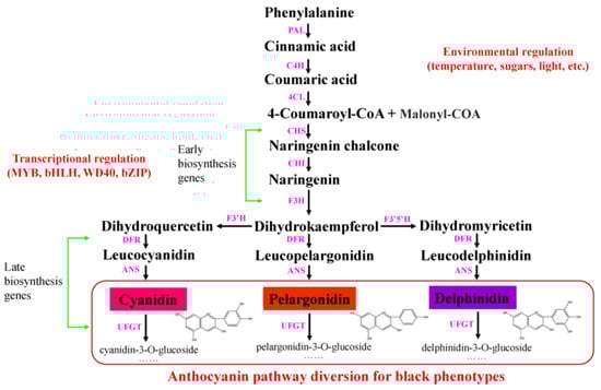 A simplified schematic of the anthocyanin pathway leading to black phenotypes in plant. PAL: Phenylalanine ammonia lyase. C4H: cinnamate 4-hydroxylase. 4CL: 4-coumaroyl-CoA ligase; CHS: Chalcone synthase; CHI: Chalcone isomerase; F3H: Flavanone-3-hydroxylase; F3′H: Flavanone-3′-hydroxylase; F3′5′H: Flavanone-3′,5′-hydroxylase; DFR: Dihydroflavonol-4-reductase; ANS: Anthocyanidin synthase; UFGT: UDP-glucose flavonoid 3-O-glucosyltransferase.