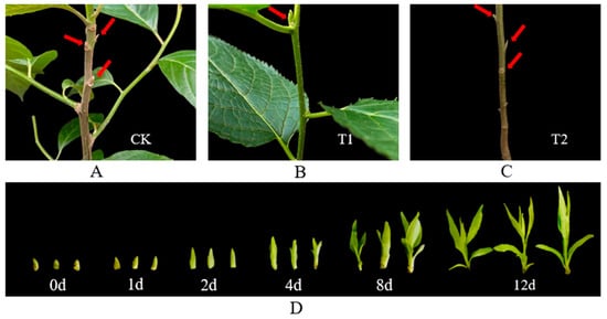 Morphological characterization of the three kinds of materials. (A) Phenotypes of upper buds (CK, red arrows). (B) Phenotypes of tip buds (T1, red arrows). (C) Phenotypes of bottom dormant buds (T2, red arrows). (D) Phenotypes from the shoot apex to the branches in T1.