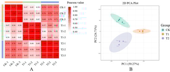 Pearson correlation coefficients of the sequencing data from three replicates of each sample collected from upper buds (CK), tip buds (T1), and bottom buds (T2) (A). Principal component analysis (PCA) of transcriptome data of the samples collected form CK, T1, and T2 (B).