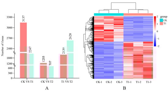 Analysis of differentially expressed genes (DEGs). (A) Statistical analysis of up- and downregulated DEGs between three groups. (B) Hierarchical cluster analysis of DEGs between CK and T1.