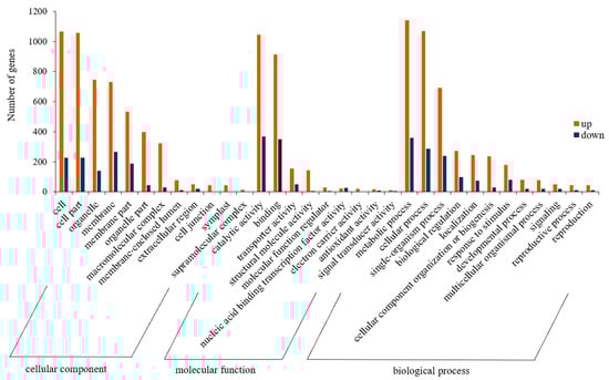 GO analysis was performed on the set of DEGs identified between the CK and T1. The GO classification results showed that 6244, 3205, and 5400 unigenes were assigned to the GO categories of biological processes, cellular components, and molecular functions, respectively (Figure 4). In the classification of cellular components, upregulated DEGs were generally found in the cell, cell part, organelle, and membrane entries, while downregulated DEGs were focused on the membrane, cell, cell part, and membrane part. A substantial number of DEGs were linked to the catalytic, binding, and transporter activity in the classification of molecular function. In the classification of biological processes, up- and downregulated DEGs were mostly annotated to metabolic process, cellular process, and single-organism process entries, especially in the metabolic process category, which had the most concentrated DEGs.