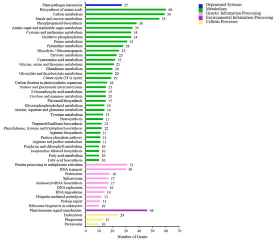 We also carried out KEGG pathway enrichment analysis on a group of DEGs screened via transcriptome sequencing for CK vs. T1 (Figure 5). The KEGG classifications were separated into cellular processes, environmental information processing, genetic information processing, metabolism, and organismal systems categories. In the cellular processes category, peroxisome (10 DEGs), phagosome (13 DEGs), and endocytosis (24 DEGs) were significantly enriched in CK vs. T1. Plant hormone signal transduction (46 DEGs) was significantly enriched in the environmental information processing category. Protein processing in the endoplasmic reticulum (31 DEGs) was significantly enriched in the genetic information processing category. The metabolism category had the largest number of DEGs, and these genes were focused on the biosynthesis of amnio acids (60 DEGs), carbon metabolism (59 DEGs), and starch and sucrose metabolism (55 DEGs) entries.