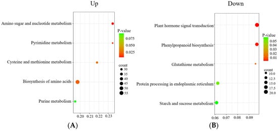 KEGG enrichment analysis of DEGs of CK vs. T1. (A) KEGG analysis of upregulated DEGs with CK vs. T1. (B) KEGG analysis of downregulated DEGs with CK vs. T1.