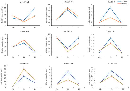 We selected nine DEGs for RT‒qPCR validation in order to confirm the accuracy of the RNA-seq results. These DEGs were primarily chosen from genes that related to the auxin signaling pathway. As shown in Figure 7, the similarities between the RT‒qPCR results and RNA-seq data confirmed the accuracy of the RNA-seq results. Among these nine DEGs, the c-28669-c0 and c-56074-c0 showed the highest and second highest expression, respectively. The expression pattern of c-54871-c1 and c-57107-c1 differed from that of the other genes. The expression levels of most genes were higher in T1 than in CK and T2.