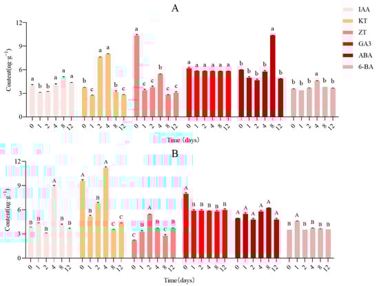 We measured the content of GA3, IAA, KT, ABA, ZT, and 6-BA. There were significant differences among the contents of the six endogenous hormones (Figure 8). KT and IAA contents were higher than other hormones at day 4 in the tip buds, exhibiting a trend of first increasing (day 2 to day 4) and then decreasing (day 4 to day 8) (Figure 8B). The ZT content gradually increased during the early stage, demonstrating the diametrically opposite trend in upper buds (Figure 8A), and ZT content in the tip buds was higher than upper buds on day 2 and day 12 (Figure 8B). ABA content was the highest at day 8 in the upper buds, while ABA content was not dominant in the tip buds. There was no significant difference between the levels of GA3 and 6-BA in the upper and tip buds. Then, IAA content increased significantly (p < 0.05) in tip buds on day 4 compared with day 0, and was higher than upper buds on day 4.