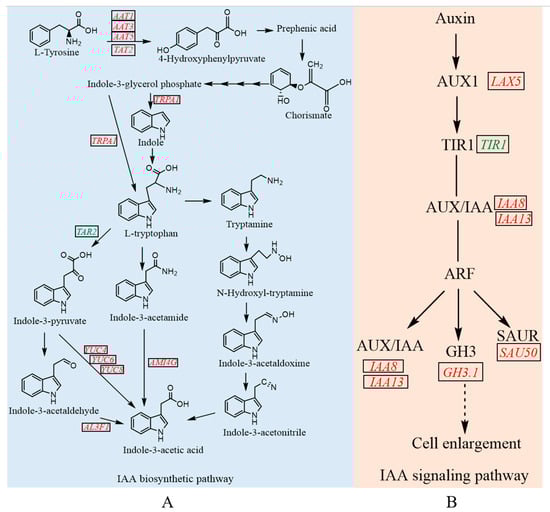 DEGs were involved in IAA biosynthesis pathway and signaling pathway in CK vs. T1 on day 4. (A) DEGs participated in IAA biosynthesis and metabolism pathway. (B) DEGs participated in IAA signaling pathway. The different font color represents the genes that are regulated in CK vs. T1 (red indicated upregulation; green indicated downregulation).