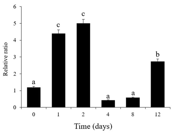 To analyze the expression profiles of the key enzyme gene involved in the IAA signaling pathway, the GH3.1 gene (this gene segment has 100% homology to GH3.1 gene from the Diospyros lotus) was investigated by real-time quantitative PCR analysis (qRT-PCR) during different stages of the germination process. The results showed that the expression of the GH3.1 gene (LOC127802819) was significantly (p < 0.05) upregulated from day 0 to day 2 (Figure 10), while the IAA content of tip buds (T1) was maintained in a low concentration range (Figure 8B). On day 4, the gene was significantly downregulated (Figure 10), but the content of IAA showed the opposite trend (Figure 8B). Then, the content of this gene gradually increased from day 8 to day 12 (Figure 10). However, the IAA content still showed the opposite trend at this stage and gradually decreased (Figure 8B).