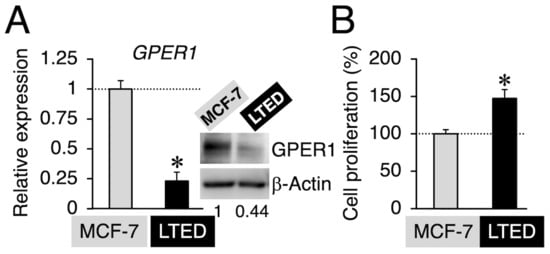 Highly proliferative long-term estrogen-deprived (LTED) cells display a lower expression of G protein-coupled estrogen receptor 1 (GPER1). (A) Basal GPER1 mRNA and GPER1 protein (inset) expression in MCF-7 and LTED cells. Data are presented as the mean ± S.E. (n = 6) of the fold induction from MCF-7 cells. Significant differences (by Student’s t-test) to MCF-7 cells are marked with an asterisk (* p < 0.05). (A, inset) Western blot analysis was performed using antibodies specific for GPER1 and β-actin, respectively. Representative images are shown. The band intensity of GPER1 (MCF-7 lane as 1) was quantified using the ImageJ 1.46r software and normalized to the band intensity of β-actin. Data are shown below the blot image. (B) Basal proliferation in MCF-7 and LTED cells. Data are presented as the mean ± S.E. (n = 6) percentage of MCF-7 cells. Significant differences (by Student’s t-test) to MCF-7 cells are marked with an asterisk (* p < 0.05).