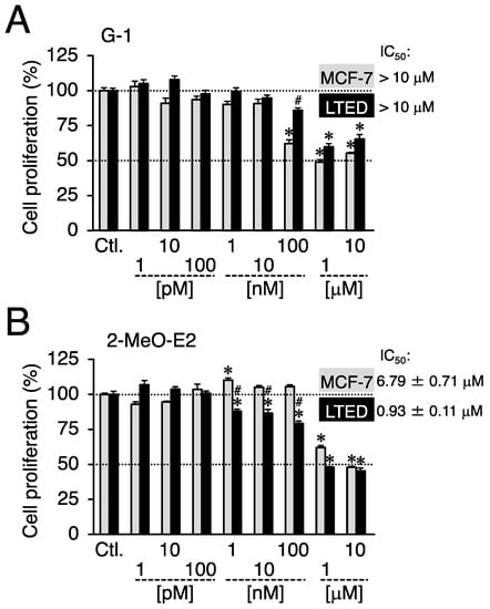 On LTED cells, 2-methoxyestradiol (2-MeO-E2) exerted selective antiproliferative effects. MCF-7 and LTED cells were treated with G-1 (1 pM to 10 μM) (A) or 2-MeO-E2 (1 pM to 10 μM) (B) for 48 h. The control sample (indicated as Ctl.) cells were treated with the vehicle. Data are presented as the mean ± S.E. (n = 6) percentage of the vehicle-treated control. Significant differences (by two-way ANOVA, followed by Tukey–Kramer’s post hoc test) as compared with the vehicle-treated control for each cell and compared with MCF-7 cells are marked with asterisks (* p < 0.05) and hashes (# p < 0.05), respectively.