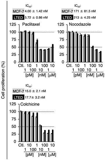 Prior to conducting experiments to determine whether G-1 and 2-MeO-E2 negatively affected the proliferation of LTED and MCF-7 cells by targeting GPER1, we confirmed the expression profile of GPER1 in these breast cancer cells. The mRNA expression level of GPER1 was less than that (0.23-fold, p < 0.05) in LTED cells compared to that in parental MCF-7 cells (Figure 2A). Consistent with the mRNA expression profile, GPER1 protein expression displayed a similar trend (0.44-fold) (Figure 2A, inset) [6]. As shown in Figure 2B, LTED cells exhibited more aggressive proliferative features than MCF-7 cells. The reduced expression of GPER1 favors cell aggressiveness, such as stimulated cell proliferation, particularly in LTED cells, as indicated in the reports suggesting that GPER1 can act as a tumor suppressor in different types of cancers, including breast cancer [33,34,35,36]. Therefore, the possible negative (antiproliferative) effects of GPER1 agonists (G-1 and 2-MeO-E2) [8,17] on the aggressive behavior of LTED cells were not observed or weakened. Therefore, we investigated the validity of this hypothesis. Both LTED and MCF-7 cells were exposed to G-1 and 2-MeO-E2 in varying concentrations from 1 pM to 10 μM for 48 h; 2-MeO-E2 exhibited potent/selective inhibitory effects on the proliferation of LTED cells as compared with that on MCF-7 cells (IC50 values: 6.79 ± 0.71 and 0.93 ± 0.11 μM, respectively) (Figure 3A,B). Furthermore, the antiproliferative effects of 2-MeO-E2 on LTED cells were prolonged in a time-dependent manner for up to 96 h, with lower IC50 values of 0.55 ± 0.02 and 0.40 ± 0.02 μM observed at 72 and 96 h, respectively (Supplemental Figure S1). To confirm the antiproliferative selectivity of 2-MeO-E2 in LTED cells, we investigated other representative microtubule-destabilizing agents (i.e., paclitaxel, nocodazole, and colchicine) belonging to the same group as G-1 and 2-MeO-E2 [24,37]. Although they exhibited stronger antiproliferative effects than 2-MeO-E2, none of the antiproliferative agents displayed selective inhibitory potential for the proliferation of LTED cells (Figure 4). Thus, among the molecules that interact with tubulins, it is strongly suggested that 2-MeO-E2 is a selective antiproliferative molecule for LTED cells.