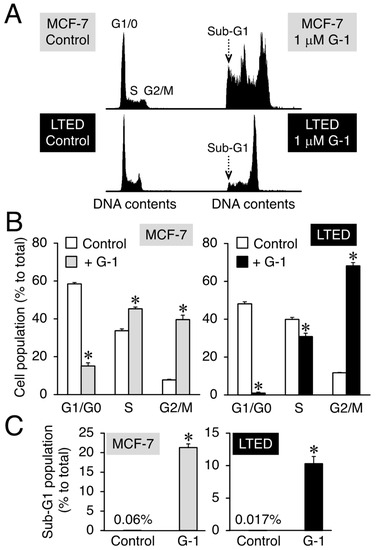 Depending on the concentration used, G-1 can evoke suppressive effects on the proliferation of MCF-7 cells, coupled with apoptosis [6,14]. Furthermore, G-1 decreased the percentage of the cell population in the G1 phase and increased the number of MCF-7 cells in the G2/M phase [14]. Based on these findings, we first performed flow cytometry analysis to study the LTED cell cycle progression after exposure to 1 μM G-1 for 48 h and used MCF-7 cells as a positive control. The flow cytometry results showed that G-1 induced G1 phase downregulation and G2/M phase stimulation in MCF-7 cells compared to that in the vehicle-only treated control (Figure 5A, upper panel; Figure 5B, left panel). We focused on the interplay between G-1 and LTED cells and found that the cell population exhibited characteristics similar to those of MCF-7 cells after exposure to G-1 (Figure 5A, lower panel; Figure 5B, right panel). G-1 induced a population of cells in the sub-G1 phase (a hallmark of apoptosis) in both breast cancer cell lines. The fold induction of the sub-G1 population after G-1 treatment was approximately 355-fold (0.06% vs. 21.3% in MCF-7 cells) and 617-fold (0.017% vs. 10.3% in LTED cells) higher than that in the controls (Figure 5A,C). Cellular morphology analysis after exposure to 1 μM G-1 for 48 h indicated membrane blebbing. One of the apoptotic cell markers [38] was detected in both MCF-7 and LTED cells (Supplementary Figure S2). Considering the significant appearance of the sub-G1 peak after G-1 exposure, G-1 treatment was presumed to decrease the proliferation of LTED cells and induce apoptotic signaling, as previously observed in MCF-7 cells [14].