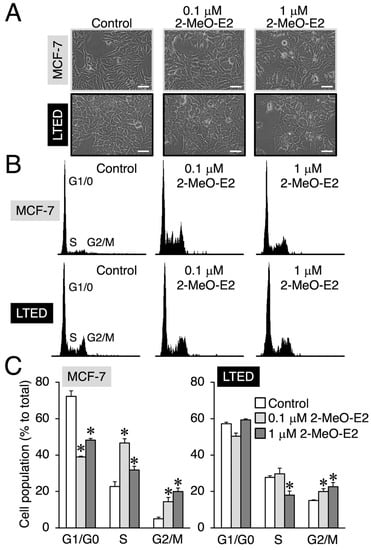 At the G2/M phase, 2-MeO-E2 arrests LTED cells without accompanying sub-G1. MCF-7 and LTED cells were treated with 2-MeO-E2 (0.1 and 1 μM) for 48 h. The control sample was treated with the vehicle. (A) Morphology of 2-MeO-E2-treated cells. Representative images are shown. The images were acquired at 400× magnification. Scale bar is indicated as 50 μm. (B) Representative histograms are shown. (C) The percentage of cells in the G1, S, and G2/M phases are shown. Data are presented as the mean ± S.E. (n = 3). Significant differences (by one-way ANOVA, followed by Dunnett’s post hoc test) as compared with the vehicle-treated control are marked with asterisks (* p < 0.05).