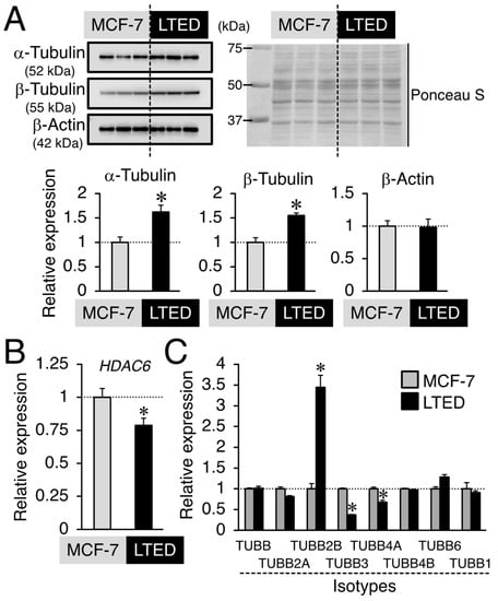 Expression profiles of β-tubulin and its isotype in MCF-7 and LTED cells. (A) Basal α-tubulin, β-tubulin, and β-actin protein expression in MCF-7 and LTED cells. (Upper left panel) Western blot analysis was performed using antibodies specific for α-tubulin, β-tubulin, and β-actin, respectively. (Upper right panel) Ponceau S staining was performed to indicate total protein loading in each lane. (Lower panel) The band intensity was quantified using the ImageJ 1.46r software. Data are presented as the mean ± S.E. (n = 3) of the fold induction from MCF-7 cells. Significant differences (by Student’s t-test) to MCF-7 cells are marked with asterisks (* p < 0.05). (B,C) mRNA expression of Basal histone deacetylase 6 (HDAC6) (B) and β-tubulin (TUBB) isotypes (C) in MCF-7 and LTED cells. Data are presented as the mean ± S.E. (n = 6) of the fold induction from MCF-7 cells. Significant differences (by Student’s t-test) to MCF-7 cells are marked with asterisks (* p < 0.05).