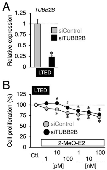 Effects of TUBB2B siRNA (siTUBB2B) on antiproliferation by 2-MeO-E2 against LTED cells. (A) mRNA expression of TUBB2B in LTED cells transfected with control siRNA (siControl) or siTUBB2B. Data are presented as the mean ± S.E. (n = 3) of the fold induction from the siControl-transfected group. Significant differences (by Student’s t-test) to the siControl-transfected group are marked with an asterisk (* p < 0.05). (B) LTED cells were transfected with siControl or siTUBB2B, followed by treatment with 2-MeO-E2 (1 pM to 100 nM). Data are presented as the mean ± S.E. (n = 6) percentage of the vehicle-treated control. Significant differences (by two-way ANOVA, followed by Tukey–Kramer’s post hoc test) as compared with the vehicle-treated control and compared with the siControl-transfected group are marked with asterisks (* p < 0.05) and hashes (# p < 0.05), respectively.