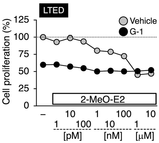 The binding potential of G-1 to β-tubulin is stronger than that of 2-MeO-E2 [14,16]. Therefore, we investigated whether adding G-1 abrogated the 2-MeO-E2-mediated inhibition of LTED cell proliferation. Compared with the control group, 2-MeO-E2-treated cells showed reduced proliferation in a concentration-dependent manner at concentrations up to 10 µM. At 1 μM, G-1 treatment alone reduced the proliferation of LTED cells to approximately 60% of that of the control. However, an additive antiproliferative interaction between 2-MeO-E2 and G-1 was not observed, and the degree of inhibition was comparable to that of the G-1 alone system (Figure 9). Thus, G-1 and 2-MeO-E2 may share a mechanism of action with β-tubulin in LTED cells.