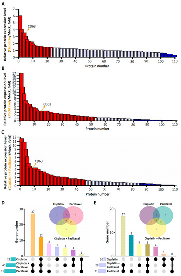 Protein expression levels in ES2 cells treated with different chemotherapeutic agents. The figure shows differentially expressed proteins in EVs isolated from ES2 cells treated with cisplatin alone (A), ES2 cells treated with paclitaxel alone (B), and ES2 cells treated with both cisplatin and paclitaxel (C) (unpaired Student’s t test, p < 0.05, with a fold-change cutoff of ≥1.5 for upregulation and downregulation). (D) Protein number refers to the number of upregulated proteins in each pair of ES2 cells treated with different chemotherapeutic agents. The Wayne diagram depicts the intersection of differentially expressed genes. (E) Protein number refers to the number of downregulated proteins in each pair of ES2 cells treated with different chemotherapeutic agents. The Wayne diagram shows the intersection of differentially expressed genes.
