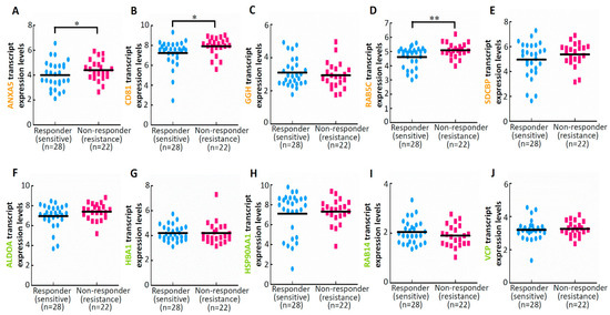 Results of drug sensitivity analysis of differentially expressed proteins in EVs isolated from cisplatin-treated ES2 cells. (A–E) Expression levels of five upregulated proteins (genes) in response to the combination of cisplatin and paclitaxel. (F–J) Expression levels of five downregulated proteins (genes) in response to the combination of cisplatin and paclitaxel. * p < 0.05 and ** p < 0.01.