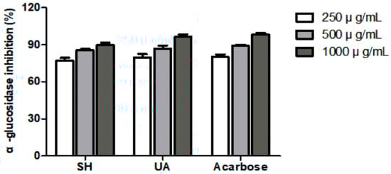 3.1. α-Glucosidase Inhibitory Activity of SH and UA