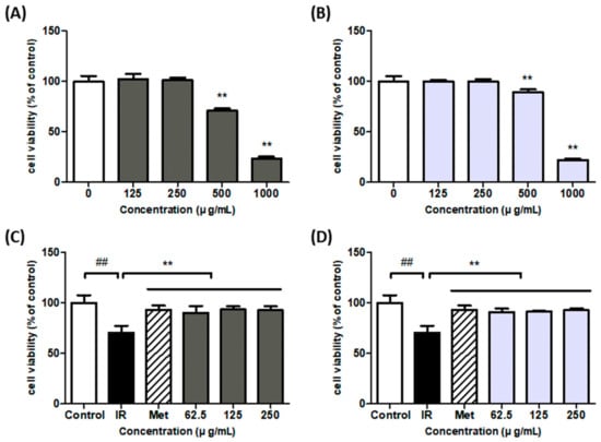 The effect of the extract on the viability of HepG2 and IR-HepG2 cells was evaluated using the WST-1 reagent (Cellvia, AbFrontier, Seoul, Republic of Korea). HepG2 cells were seeded in 96-well culture plates at 1 × 105 cells/mL and cultured for 24 h. Extracts were then prepared at different concentrations (125, 250, 500, and 1000 μg/mL) in a medium without FBS, treated with cells, and cultured in a 37 °C 5% CO2 incubator for 24 h. Next, 10 μL of WST-1 reagent was added to the medium and incubated for 30 min in a 37 °C, 5% CO2 incubator. The absorbance was measured at 450 nm using a microplate reader (Varioskan LUX, Thermo Fisher Scientific). Cell viability was compared to the absorbance of the control group.