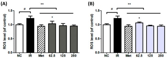 Effects of Sargassum horneri and Ulva australis treatment on the intracellular ROS content in IR-HepG2 cells. ROS content in IR-HepG2 cells was detected using a fluorescence microplate. ROS content after treatment with (A) S. horneri and (B) U. australis extracts. The ROS content in the IR-HepG2 group was significantly higher than that in the control group. Treatment with the extract and metformin significantly lowered ROS levels. Data are expressed as mean ± standard deviation (n = 3). Significant differences: * p < 0.05, ** p < 0.01 vs. IR group; # p < 0.05 vs. NC group.