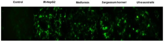 Analysis of ROS level of IR-HepG2 cells according to Sargassum horneri and Ulva australis extracts treatment using fluorescence microscopy. After the induction of IR-HepG2, the extract (250 μg/mL) and metformin (1 mM) were added and cultured for 24 h, and then the cells were stained using 10 μM DCFH-DA. When the fluorescence level of the cells was confirmed using a fluorescence microscope, IR-HepG2 cells showed overall fluorescence, whereas the fluorescence expression of the extract and metformin decreased (magnification ×400).
