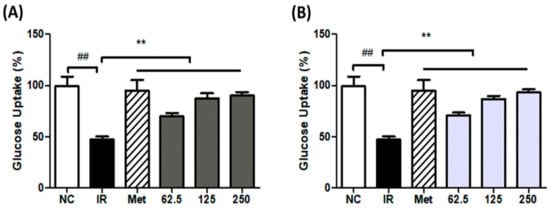 Effects of Sargassum horneri and Ulva australis treatment on glucose uptake in IR-HepG2 cells. Percentage of cellular glucose uptake (%) after (A) S. horneri extract and (B) U. australis extract treatment. The glucose uptake rate of the IR-HepG2 group was significantly lower than that of the NC group, and the glucose uptake rate significantly increased with extract and metformin treatment. Data are expressed as mean ± standard deviation (n = 3). Significant differences: ** p < 0.01 vs. IR group; ## p < 0.01 vs. NC group.