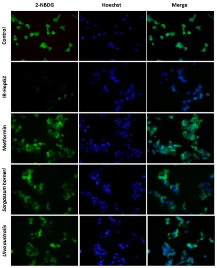 Cellular glucose uptake rate in IR-HepG2 cells with Sargassum horneri and Ulva australis extracts treatment. After induction of IR-HepG2, the extract (250 μg/mL) and metformin (1 mM) were added and cultured for 24 h. The cells were then stained with 40 μM 2-NBDG, and the fluorescence intensity of 2-NBDG was used to determine the extent of glucose uptake in control and insulin-resistant HepG2 cells. The number of cells was evaluated using Hoechst 33342 staining and confirmed using a fluorescence microscope (magnification ×400). Fluorescence intensity images were merged using ImageJ software V1.52.
