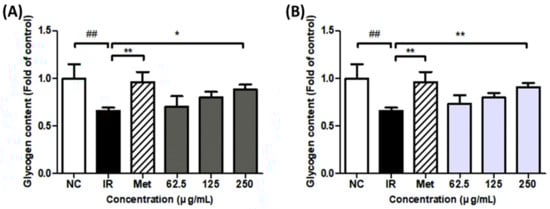 Effect of Sargassum horneri and Ulva australis on glycogen contents in IR-HepG2 cells. Intracellular glycogen content of IR-HepG2 cells following treatment with (A) S. horneri extract and (B) U. australis extract. The IR-HepG2 group exhibited significantly lower levels than the control group. Compared to the IR-HepG2 group, metformin and the extract at 1 mM were significantly higher at a concentration of 250 μg/mL. Data are expressed as mean ± standard deviation (n = 3). Significant differences: * p < 0.05, ** p < 0.01 vs. IR group; ## p < 0.01 vs. NC group.