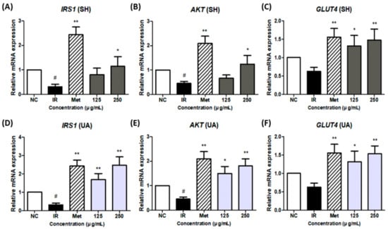 To investigate whether insulin resistance could be alleviated by SH and UA extracts, the expression levels of IRS-1/AKT/GLUT4 transcription factors were measured. IR-HepG2 cells were treated with SH and UA extracts (125 and 250 μg/mL, respectively) and metformin (1 mM), which served as a positive control, and cultured for 24 h for subsequent analysis. The mRNA expression levels of IRS-1 and AKT were downregulated in IR-HepG2 cells compared with those in normal cells. In the extract and metformin treatment groups, the mRNA levels were upregulated, and the results confirmed that the mRNA level in the UA extract treatment group was higher than that in the SH extract treatment group (Figure 8).