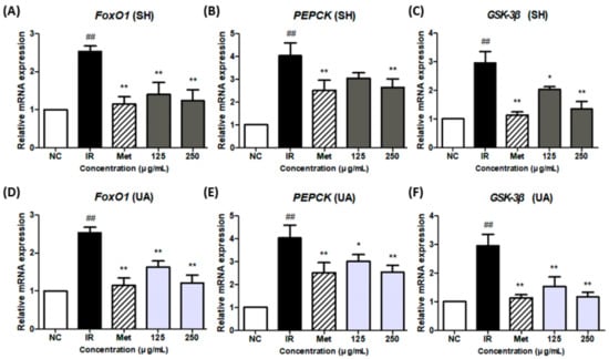 In addition, the mRNA expression of GSK-3β, which regulates glycogen synthesis in response to insulin, was analyzed. IR-HepG2 cells showed upregulated mRNA expression compared to normal cells, whereas these changes were suppressed in the extract- and metformin-treated groups (Figure 9C,F). These results confirmed that the mRNA levels of genes related to glucose metabolism in the groups treated with the SH and UA extracts were suppressed to a level similar to that in the group treated with metformin.
