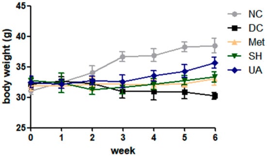 Changes in body weight for 6 weeks in diabetic mice induced by streptozotocin following oral administration of the extracts. Weekly changes in body weight. NC, normal control; DC, diabetic control; Met, metformin 100 mg/kg; SH, Sargassum horneri extract 500 mg/kg; UA, Ulva australis extract 500 mg/kg. Each value represents the mean ± standard deviation (n = 5).