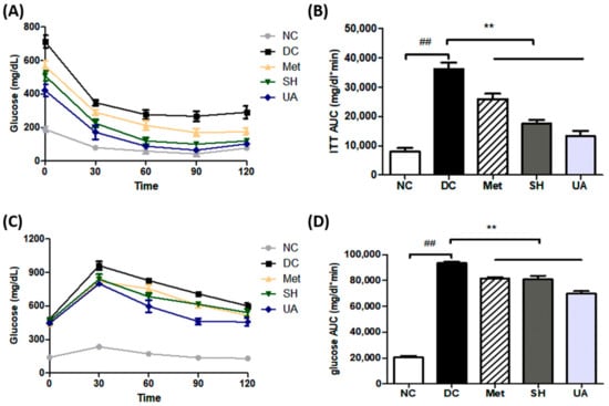 The blood glucose levels 30 min after glucose administration were 900 mg/dL in the diabetic group and 800 mg/dL in the groups administered metformin, SH, and UA extracts. After 60 min, the blood glucose levels were the lowest in the UA-administered group. Analysis of the AUC using the oral glucose tolerance graph confirmed that the group treated with metformin, SH, and UA extracts showed significantly decreased glucose tolerance compared with the diabetic group (Figure 11C,D).