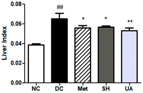 The effects of the SH and UA extracts on body weight changes in animals with diabetes induced by the administration of streptozotocin (40 mg/kg) for 5 days were analyzed. Before the start of the experiment, the body weight was 31.0 to 32.5 g, and there was no difference in body weights between the experimental groups. Body weight was analyzed for six weeks after the substance was administered, and the weight gain rate of the diabetic animals was found to be lower than that of the normal group. In the group administered metformin and the extract, weight increased from the third week, but, in the diabetes group, weight gradually decreased (Figure 10).