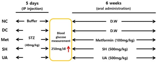 The purchased six-week-old male ICR mice were raised under specific pathogen-free conditions (KOSA BIO Inc., Sungnam, Republic of Korea). The mice were maintained in a stable breeding environment with a light/dark cycle of 12 h a day at a temperature of 23 ± 3 °C, relative humidity of 50 ± 10%, and 150 to 300 Lux. The experimental animals were acclimated to the environment for one week before the experiment and allowed free access to standard feed (Samtako Bio Korea, Seoul, Republic of Korea) and water. After the adaptation period, just before administration, streptozotocin (STZ, Sigma-Aldrich) was dissolved in cold 0.09 M citrate buffer (Sigma-Aldrich) and intraperitoneally administered to the animals at 40 mg/kg for 5 days [,]. To confirm whether hyperglycemia was induced 72 h after the injection, blood glucose levels were measured in the tail vein using a glucometer. Animals with blood glucose levels of 250 mg/dL were selected for this study. The ICR mice were divided into six groups: (1) normal, (2) diabetic, (3) metformin (100 mg/kg/day), (4) SH (500 mg/kg/day), and (5) UA (500 mg/kg/day) (Scheme 1) [,]. The groups were fed the same diet and divided into six sub-groups of five animals each. The diabetic group received PBS by oral administration, and the experimental group received metformin or its extract by oral administration for 6 weeks. This study was approved by the Institutional Animal Care and Use Committee of Catholic University of Pusan (CUP 2022-003).
