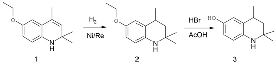 HTHQ was synthesized in two steps from the commercial product santochin 1 (Thermo Fisher Scientific, Waltham, MA, USA) using the known method (Figure 1) [18]. In the first step, santochin was hydrogenated in an autoclave in the presence of a Raney nickel catalyst [19]. In the second stage, the obtained hydroanalogue of santoquine 2 was subjected to dealkylation via the action of concentrated hydrobromic acid in a solution of glacial acetic acid.