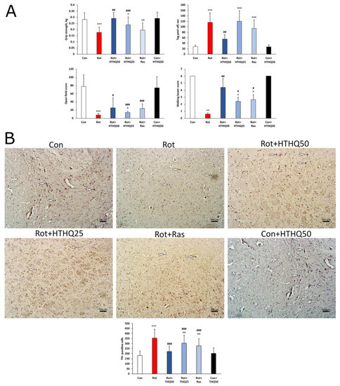 Effects of HTHQ on motor coordination scores and TH expression in rats with PD. (A) Grip strength, time taken to detach the head tag, walking beam test, and open field test scores in rats with PD treated with HTHQ. n = 12 per group. (B) Expression of TH in the brain of animals. n = 3 per group. White arrows indicate TH-positive cells. ** p < 0.01, *** p < 0.001 compared to control; # p < 0.05, ## p < 0.01, ### p < 0.001 compared to Rot; ^ p < 0.05, ^^ p < 0.01, ^^^ p < 0.001 compared to Rot + HTHQ50.