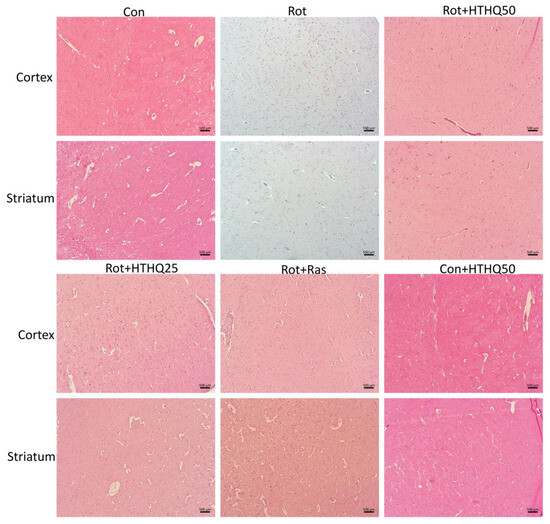 3.2. HTHQ Reduces the Severity of Histopathological Changes in Brain Tissues of Rats with PD