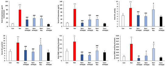 Effects of HTHQ on the severity of oxidative stress in rats with PD. Concentration of 8-isoprostane, DC, and OMP levels in brain and serum of rats with PD treated with HTHQ. n = 12 per group. ** p < 0.01, *** p < 0.001 compared to control; # p < 0.05, ## p < 0.01, ### p < 0.001 compared to Rot; ^ p < 0.05, ^^ p < 0.01 compared to Rot + HTHQ50.
