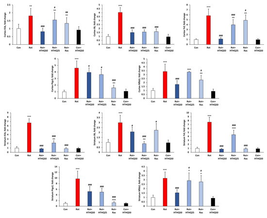 Effects of HTHQ on mRNA levels of inflammatory genes in rats with PD. The mRNA levels of Il1b, Il6, Tnf, Ptgs2, and Nfkb2 genes in the cortex and striatum of the brain of rats with PD treated with HTHQ. n = 12 per group. ** p < 0.01, *** p < 0.001 compared to control; # p < 0.05, ## p < 0.01, ### p < 0.001 compared to Rot; ^ p < 0.05, ^^ p < 0.01, ^^^ p < 0.001 compared to Rot + HTHQ 50.