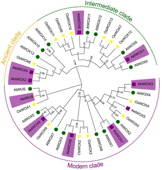 Phylogenetic tree analysis of WOX genes in A. trifolium and other species. At: A. thaliana (green); Os: O. sativa (yellow); Akt: A. trifoliata (purple).