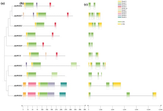 Gene and protein structure analyses of the AktWOX family. (a) Phylogenetic tree of AktWOXs. (b) Motifs of AktWOX proteins. (c) Exon-intron structures of AktWOXs.