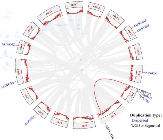 Collinearity and gene duplication events and gene clusters in AktWOXs. The red line indicates the AktWOX collinear gene pair; the two gene duplication types (dispersed, WGD or segmental) are represented in blue and black, respectively.