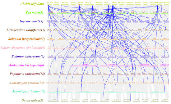 Collinearity analysis between WOX genes in A. trifoliata and WOX genes in other species. Different species names and chromosomes are represented by different colors. The blue line indicates the homologous WOX gene pairs between other species and AktWOXs, and the number in parentheses after the species name indicates the number of collinear pairs between the WOX genes of the other species and AktWOXs.