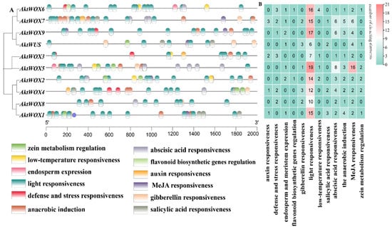 Prediction of cis-elements in the WOX promoter of A. trifoliata. (A) The distribution of cis-acting elements in the 2000 bp region upstream of the transcription start site of AktWOXs; (B) the number of cis-acting elements of the two functional categories in AktWOXs, respectively, indicated by different colors and numbers, cyan-white-red represents the increasing number of cis-acting elements.