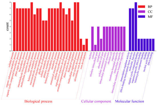 The 10 AktWOX genes were divided into three categories (Figure 6), molecular functions (MFs), cellular components (CCs) and biological processes (BPs), by GO enrichment analysis, with nine, twelve, and one hundred eighty-three subcategories (Table S8), respectively (Figure 6). Eight AktWOX genes were involved in MFs, such as transcriptional regulatory activity and DNA-binding transcription factor activity; four were involved in CCs; and seven were involved in BPs, such as RNA biosynthesis, the regulation of cell metabolism, the regulation of biosynthesis, nucleic acid metabolism and transcription regulation.
