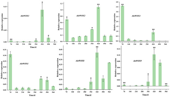 qRT−PCR analysis of the expression of 6 AktWOXs. Transcript levels of AktWOXs were calculated using the 2−∆∆Ct method. The error bars represent the standard deviations of three replicates. * represents the significance between peak expression the expression at 0 d (**, p < 0.01).