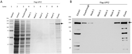Upf2p was purified using anti-Flag M2 affinity gel (Sigma-Aldrich, St. Louis, MO, USA) as previously described [4]. Briefly, cell protein extract was performed as described above. Propylene chromatography columns were filled with 1 mL of anti-Flag M2 affinity gel (Sigma-Aldrich, St. Louis, MO, USA). 15 mL of 1X TBS-T were used twice to wash the beads and 1 mL-original volume of Buffer XB (20 mM HEPES, NaOH pH = 7.4, 150 mM NaCl, 2.0 mM EDTA, 0.01% Triton X-100, 30 mM Sodium Fluoride, 30 mM β-glycerol phosphate, 5 mM Sodium Pyrophosphate, 1 mM PMSF) was added to the anti-Flag beads. The beads were then added to the protein extracts in the column and incubated overnight at 4 °C with constant rotation. Afterwards, the beads were washed once with 3 mL of Buffer XB, three times with Buffer XB-2 (20 mM HEPES, NaOH pH = 7.4, 300 mM NaCl, 2.0 mM EDTA, 0.01% Triton X-100, 30 mM Sodium Fluoride, 30 mM β-glycerol phosphate, 5 mM Sodium Pyrophosphate, 1 mM PMSF), and four times with the Buffer XB. Beads were then incubated with 200 µL of Buffer XC (20 mM HEPES, NaOH pH = 7.4, 150 mM NaCl, 2.0 mM EDTA, 0.01% Triton X-100, 30 mM Sodium Fluoride, 30 mM β-glycerol phosphate, 5 mM Sodium Pyrophosphate, 1 mM PMSF, Flag Peptide 5 µg/µL) for 15 min at 4 °C. Elution 1 was collected followed by the addition of 300 µL of Buffer XC to the beads to collect elution 2. Finally, 300 µL of Buffer XC was added to the beads to collect elution 3. Elutions were resolved in 10% SDS-PAGE, stained with Coomassie Brilliant Blue (Sigma-Aldrich, St. Louis, MO, USA), and analyzed by Western blot. BSA was used as a protein standard to determine the protein concentration.
