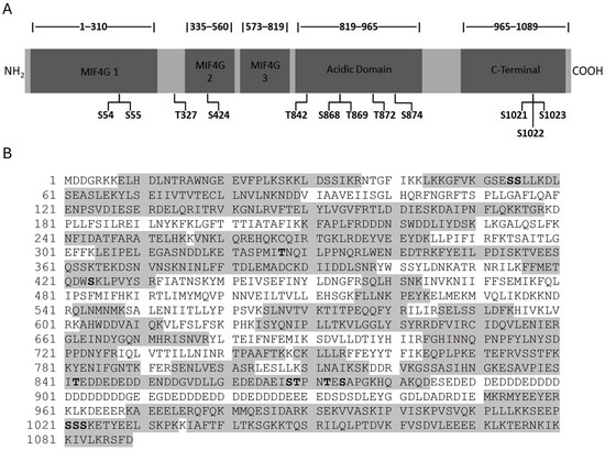 Three phosphorylation sites were identified in Upf2p mIF4G domains. (A) Illustrative representation of Upf2p showing the locations of the MIF4G-1 domain, MIF4G-2 domain, MIF4G-3 domain, acidic domain, and C-Terminal domain. The 12 phosphorylated residues identified by mass spectrometry are presented. (B) S. cerevisiae Upf2p amino acid sequence. Sixty-four percent (64%) of sequence coverage was obtained with the mass spectrometry analysis. Analyzed sequences are shown in gray and phosphorylated residues are in bold.
